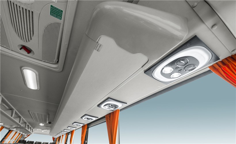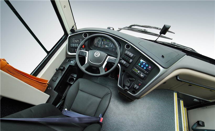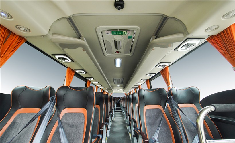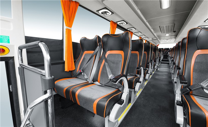 为保证乘客和驾驶员良好的乘坐体验,在驾驶舱的布局、司机及乘客座椅、阅读灯和空调出风口都做了充分的考虑。水波纹造型中顶板,跑车造型出风口,无钉化整体内饰,配合人机工程座椅,全面贴合人体坐姿。整车应用NVH静音技术,在吸声隔声结构设计基础上应用了大量隔音降噪特种材料,营造出安静的乘坐环境,让乘客的旅途更加轻松惬意。